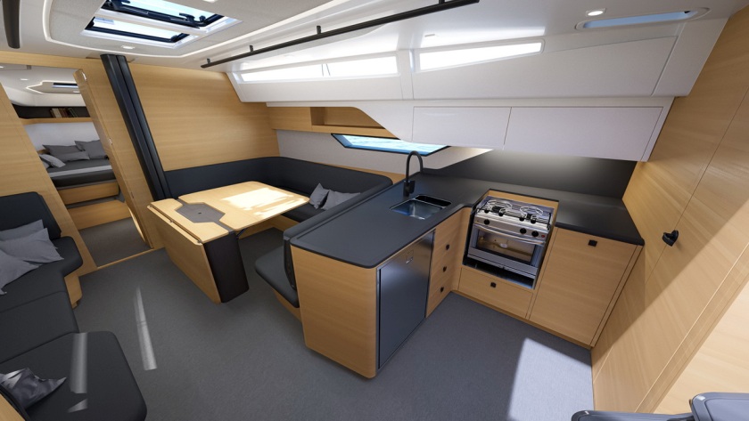 2x steering wheels, mainsail standard full-batten, genoa furling, autopilot, GPS-chart plotter in the cockpit, VHF station, radio player-Mp3 USB + external speakers, nautical charts + nautical guide, compass, depth gauge, wind gauges, sailing speeds, equipped kitchen with accessories + refrigerator, hot water, 2x toilet + shower, stern shower, stern ladder, electric anchor winch, inflatable boat + oars, sprayhood, bimini top, bowthruster, cockpit cushions, air conditioning, webasto heating, inverter, cockpit table, aft bathing platform, white hull, engine 80 Hp, fuel tank 240 l., water tank 370 l., black tank, spare parts, tools, safety equipment... Elan E6 Sailing Grace - 2025